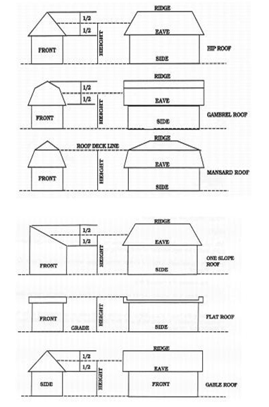 BUILDING HEIGHT. The vertical distance from the average finished grade surface at the building wall to the highest point of the coping of a flat roof or to the deck line of a mansard roof, or the mean height level between eaves and ridge for gable, hip, or gambrel roofs. Exclusions: Structures not used for human occupancy, including, but not limited to, chimneys, flag poles, television antennas, church towers, architectural features, and similar structures are excluded in determining height.