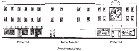 Encourage pedestrian friendly environment and pedestrian-oriented commercial enterprises and consumer services that do not rely on automobile traffic to bring consumers into the area.