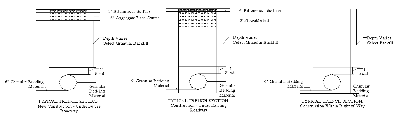 In general, all trenches excavated beneath gravel, flexible bituminous asphalt (bituminous concrete), or concrete surfaces (such as sidewalks, driveways, roads or parking lots) shall have selected granular backfill from the centerline of the pipe to the bottom of the pavement or aggregate base course. Selected granular backfill shall be used between the proposed sewer (or force main) and existing culverts and sewers that cross the trench.