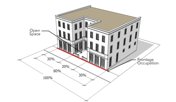 Pedestrian-oriented storefront windows and doors directly facing the street or publicly accessible open space such as courtyards, gardens, patios, or other unified landscaped areas.