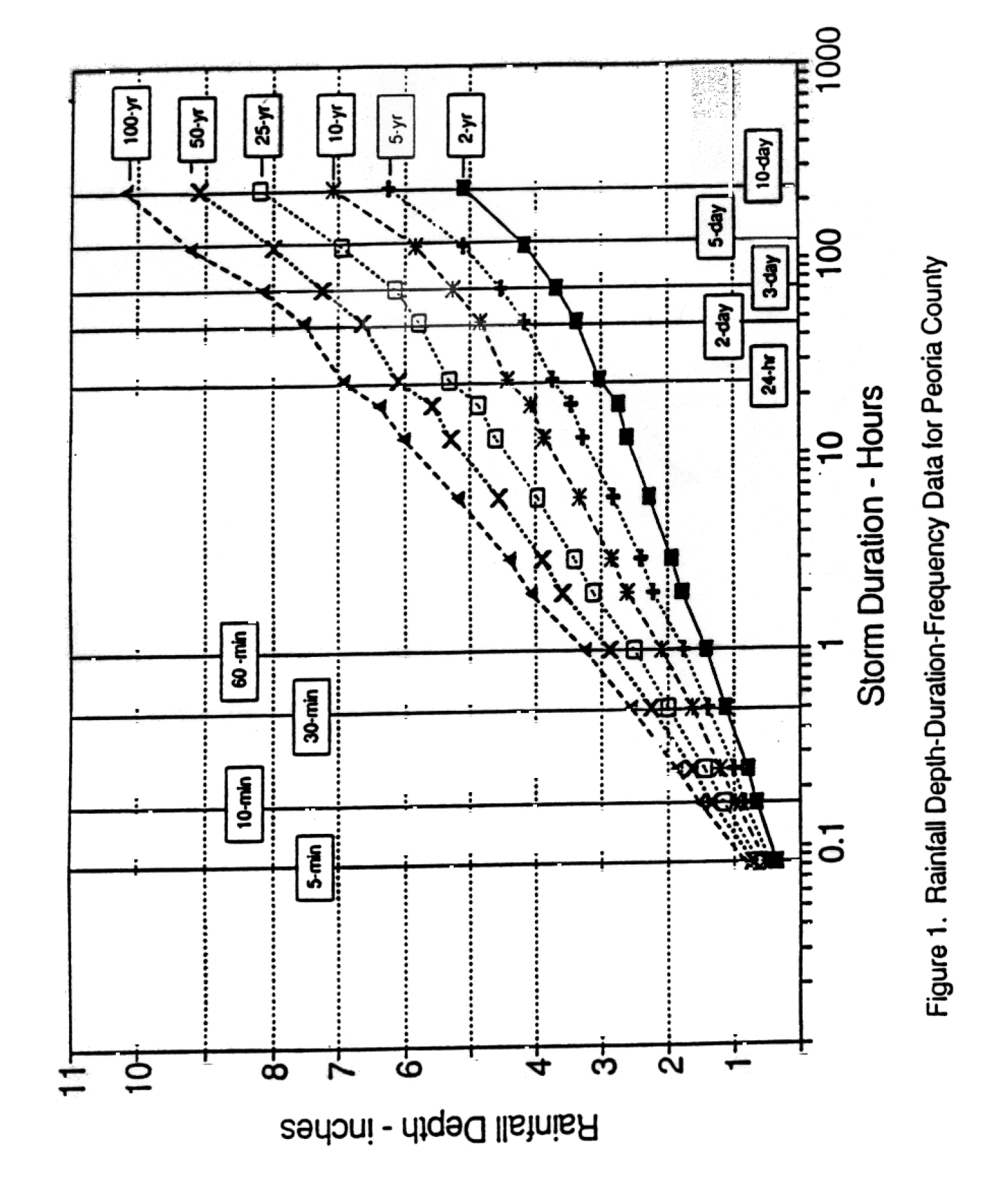 Rainfall depth and intensity data. Use data for Peoria County (Illinois State Water Survey, BUL-70/89, 1989) as presented in attached Table I and graphically in Figure 1.
