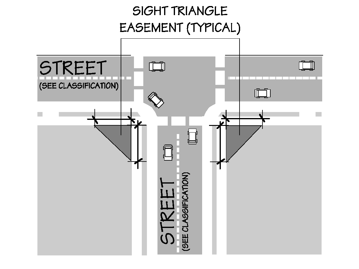 Local Streets: The triangle bounded on two (2) sides by the intersecting right-of-way lines, measured fifteen (15) feet in each direction from their point of intersection, and on the third side by the diagonal line connecting the ends of the fifteen-foot sides.