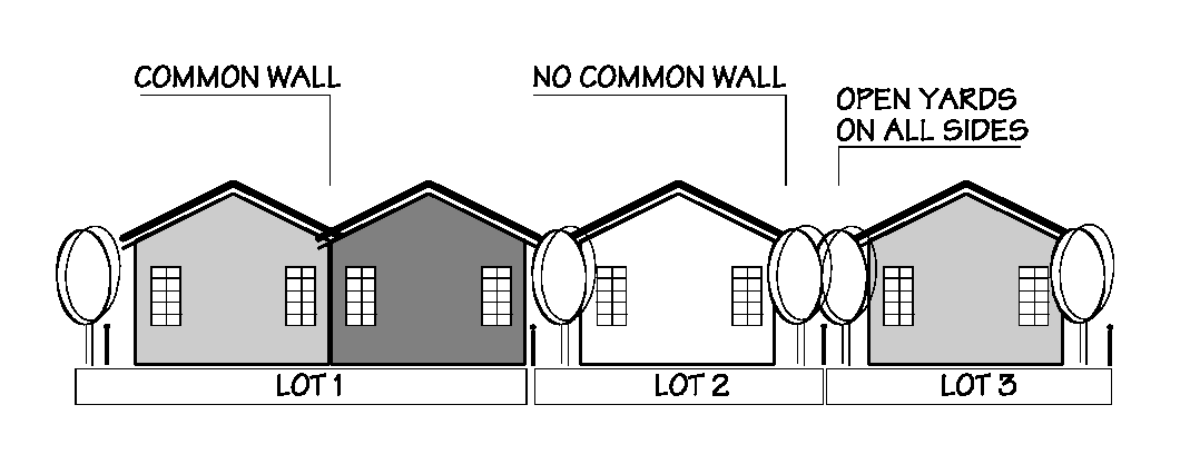 For shared wall construction, side setbacks may be zero.