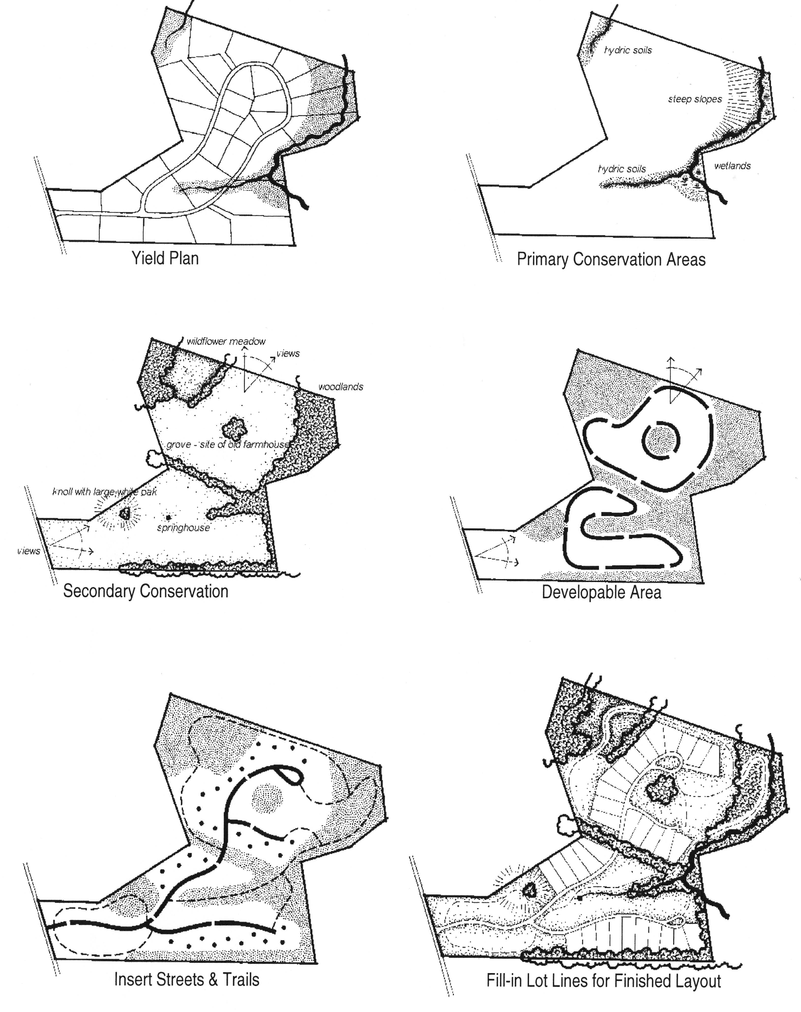 Process. The following process is encouraged, but not required, when designing the layout of a subdivision. It is taken from the concepts expressed in Conservation Subdivision Design by Randall Arendt.