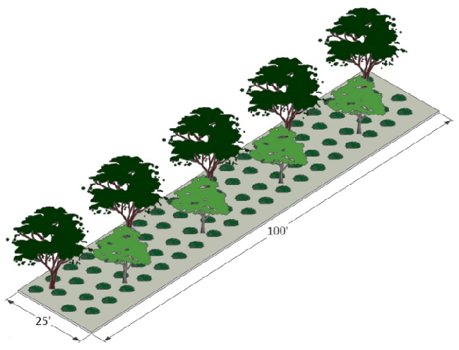 A minimum of one Overstory tree must be provided on-site for every 400 square feet of a site not covered by buildings.