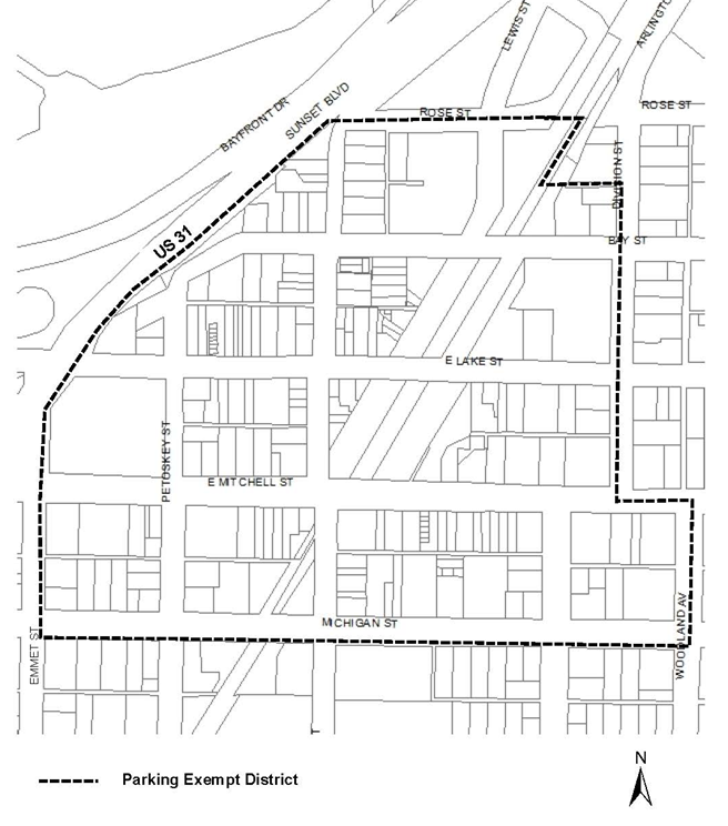 Exception to general provisions. The area delineated as the Central Business Parking Exempt District is exempt from providing off-street parking, but if off-street parking and loading requirements are provided, the lot shall meet all applicable design standards of this Zoning Code. The Central Business Parking Exempt District is defined as the area bounded by Michigan Street on the south, Rose Street on the north, U.S. 31 and Emmet Street on the west, and on the east, it follows Woodland and Division Streets to a point 138 feet north of the Bay Street right-of-way to an east-west alley, thence west to the former railroad corridor now identified as the Downtown Greenway Corridor, thence northeast until it reaches the Rose Street right-of-way as illustrated below: