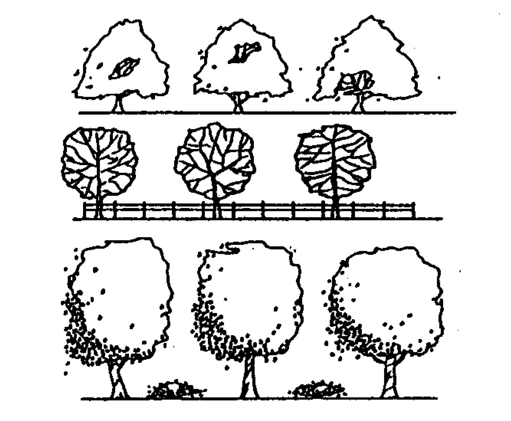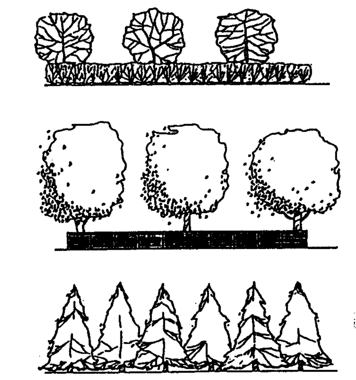 Large trees for opaque screening and large shrubs for opaque and semi-opaque evergreen screening.