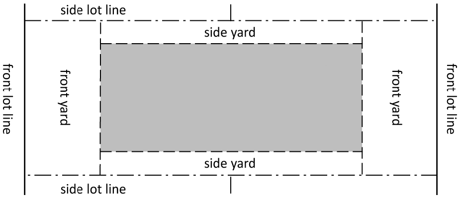 The minimum front yard setback applies to both frontages of through lots. See illustration below.