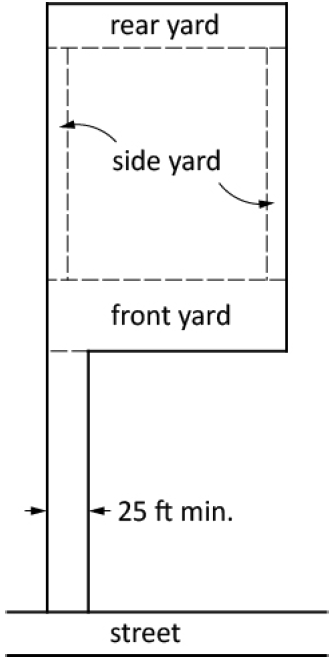 Flag Lots. The front yard setback of flag lots is measured from that lot line which is most parallel to and nearest the street from which the lot derives its access. The access strip, or flagpole, may not be less than 25 feet in width at any point. See illustration.