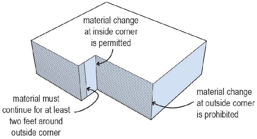 At an outside corner, any exterior building material used on one elevation must continue for at least two feet horizontally on the adjoining elevation. This is not required for inside corners. See Figure 3-3.