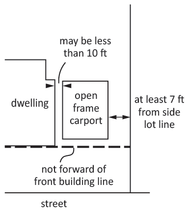 Accessory structures may not extend forward of the rear building line. However, open-frame carports, if not structurally attached to the dwelling, may be placed between the dwelling and the side lot line. In such cases, the carport may not extend forward of the front building line and must be set back at least seven feet from the side lot line (see Figure 4-2).