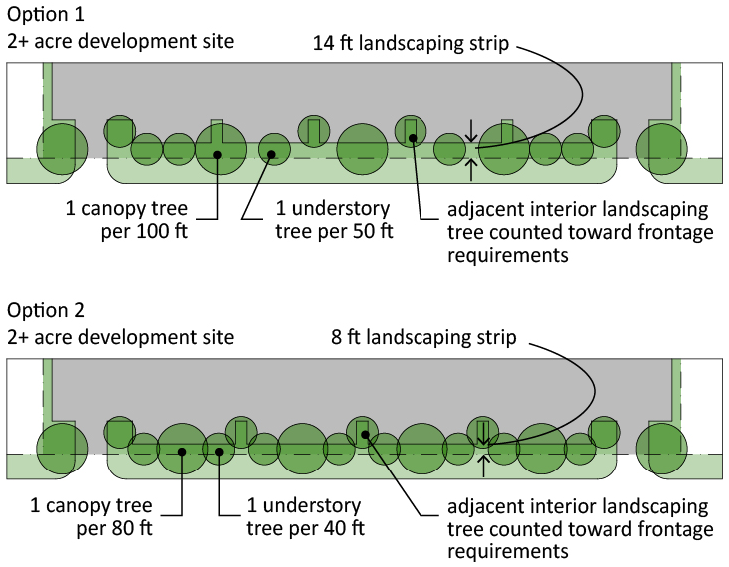 Required trees and shrubs must be spaced as evenly as practicable. Trees that are used for interior landscaping and that are within 12 feet of the frontage landscaping strip may be counted toward frontage tree requirements in Table [6-8]. See Figure 6-1.