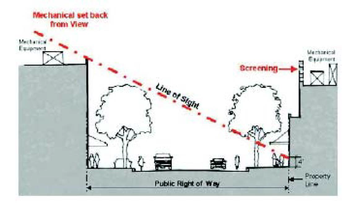 412.5.2. Mechanical screening and service areas. Utilities that serve properties may include telephone and electrical lines, ventilation systems, utility meters, mechanical equipment, transformers, generators, air conditioners, and similar features or other utility hardware. These items are among the variety of equipment that may be attached to a building that can affect the character of the area. Adequate space for these utilities should be planned in a project from the outset and they should be designed such that their visual impacts are minimized.