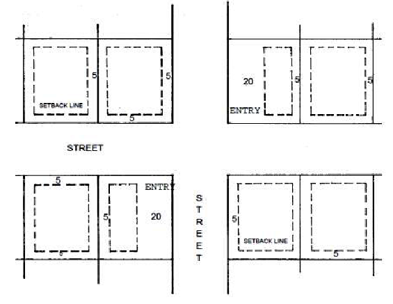 Side setback: Five feet; except approved and permitted awnings on the entry side may be three feet.