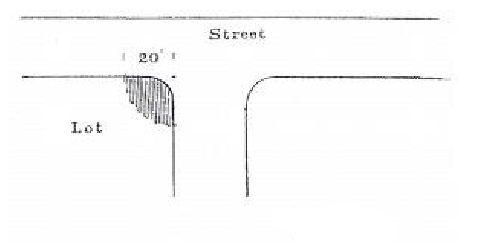 On any corner lot, no fence, structure, sign or planting shall be erected or maintained within 20 feet of the property corner so as to interfere with traffic visibility across the corner. (See following example.)