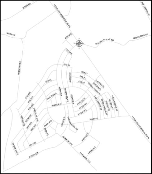 San Manuel does not have a zero point. The existing San Manuel addressing grid remains in place from the west of, but not including, the present Veterans Memorial Boulevard and applies to the established San Manuel townsite.