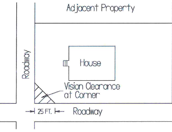 Notwithstanding any part of this chapter or any permit or variance granted, no structure, vehicle, vegetation, fence, sign, building, or any obstacle, or any portion thereof shall be placed or retained in such a manner to constitute a traffic hazard or obstruct the vision clearance of corners, curb cuts, or railroad crossings. The vision clearance area shall be a triangular shape with two sides following the lot lines parallel to the curb, to a point 25 feet from the corner, and a third side being a line connecting those two points. The clear vision area shall contain no planting, fence, wall, structure or temporary or permanent obstruction to sight exceeding 36 inches above the adjacent street grade, except for trees with branches and foliage removed to a height of eight feet above the ground.