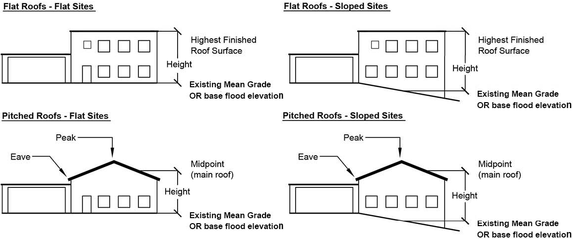 For flat roofs, height means the vertical distance from the mean (average) elevation of the existing grade to the height of the finished roof surface.