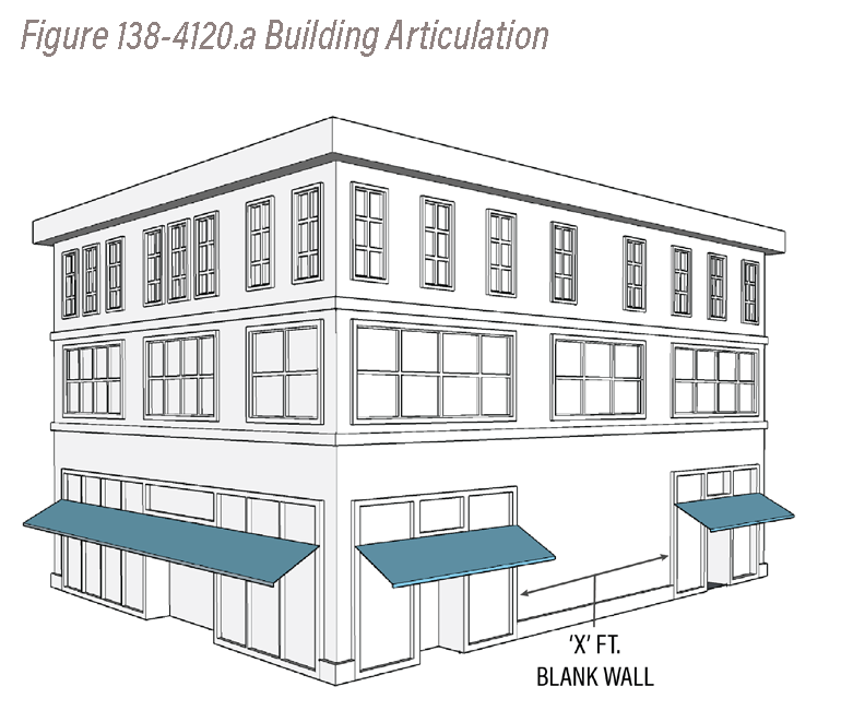Building articulation. Elements such as windows, functional doors, changes in materials, murals, reliefs/breaks in the wall or other architectural details that provide visual interest must be used to break up blank sections of wall (See LFBC Appendix: Figure 138-4120.a). The following table (LFBC Table 138-4120.b) specifies the maximum length of a blank wall for each District.