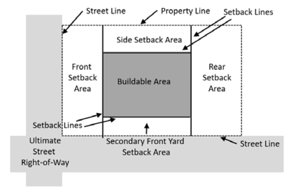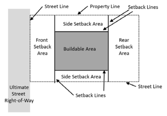 SETBACK LINE. The line or vertical plane representing the setback distance and yard depth, also described as the inner edge of any required yard. The Setback Line demarcates the vertical plane that separates a required yard from the "Buildable Area" of the lot, within which principal structures may be erected. The "Required Setback Line" is the line representing the minimum required setback distance/yard depth.