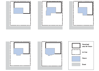The above examples illustrate various building footprints and corresponding permitted areas for fences. The illustrations are not drawn to scale and are not intended to accurately depict required setbacks or other dimensions.