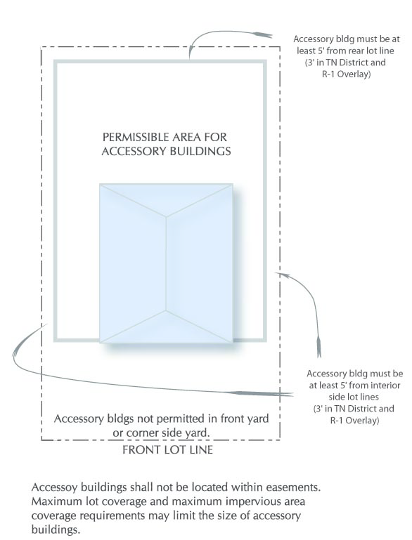 If located within the TN District or the R-1 Overlay, detached accessory buildings shall not be placed within three (3) feet of any rear or interior side lot line, and shall not be located within an easement.