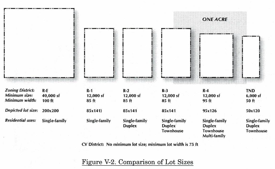 TN Traditional Neighborhood District. This district is intended to regulate new development with more traditional forms of neighborhood layout. It allows various housing types: single-family, duplex, and townhouse. Residential density is intended to be approximately 5—6 dwelling units per acre. Although it is similar to the R-3 district, it differs from the R-3 in allowing limited commercial uses, permitting alleys and smaller lot dimensions, and it has unique site design standards. One of the overall goals of the TN district is to stimulate non-motorized travel modes such as walking and biking. See section 9-55 for specific standards for the TN district. This district is not appropriate within the village core area designated as the R-1 Overlay district.