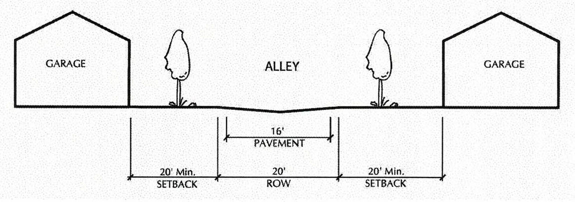Alleys. Alleys are encouraged and permitted, but shall be limited to a maximum right-of-way width of twenty (20) feet and a maximum pavement width of sixteen (16) feet. Dead-end alleys are prohibited. Alley intersections and sharp changes in alley alignment should be avoided.