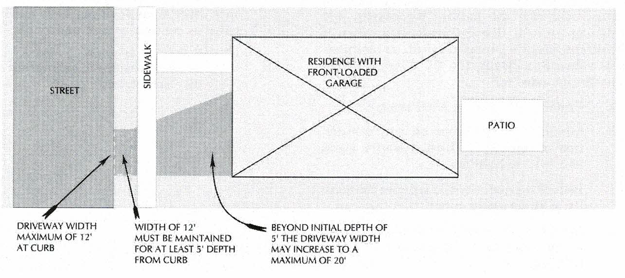 Driveway width. Maximum driveway width at curb or street shall be twelve (12) feet. This maximum width shall be maintained for minimum of five (5) feet from the curb. Thereafter, the width of the driveway may increase to twenty (20) feet, providing all other provisions, e.g., setback and impervious area coverage, are met.