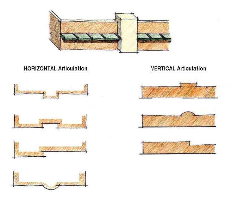 An offset, column, reveal, void, projecting rib, band or cornice;