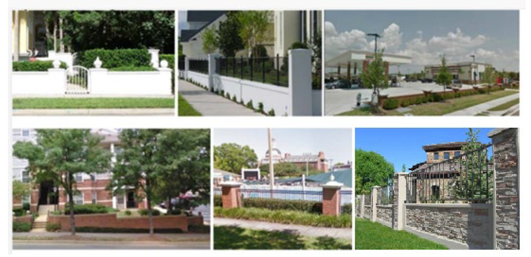 Be constructed of brick masonry, wrought iron, stone or other decorative materials and shall compliment the finishes on the building. Chain link, wire and PVC fencing are prohibited; and