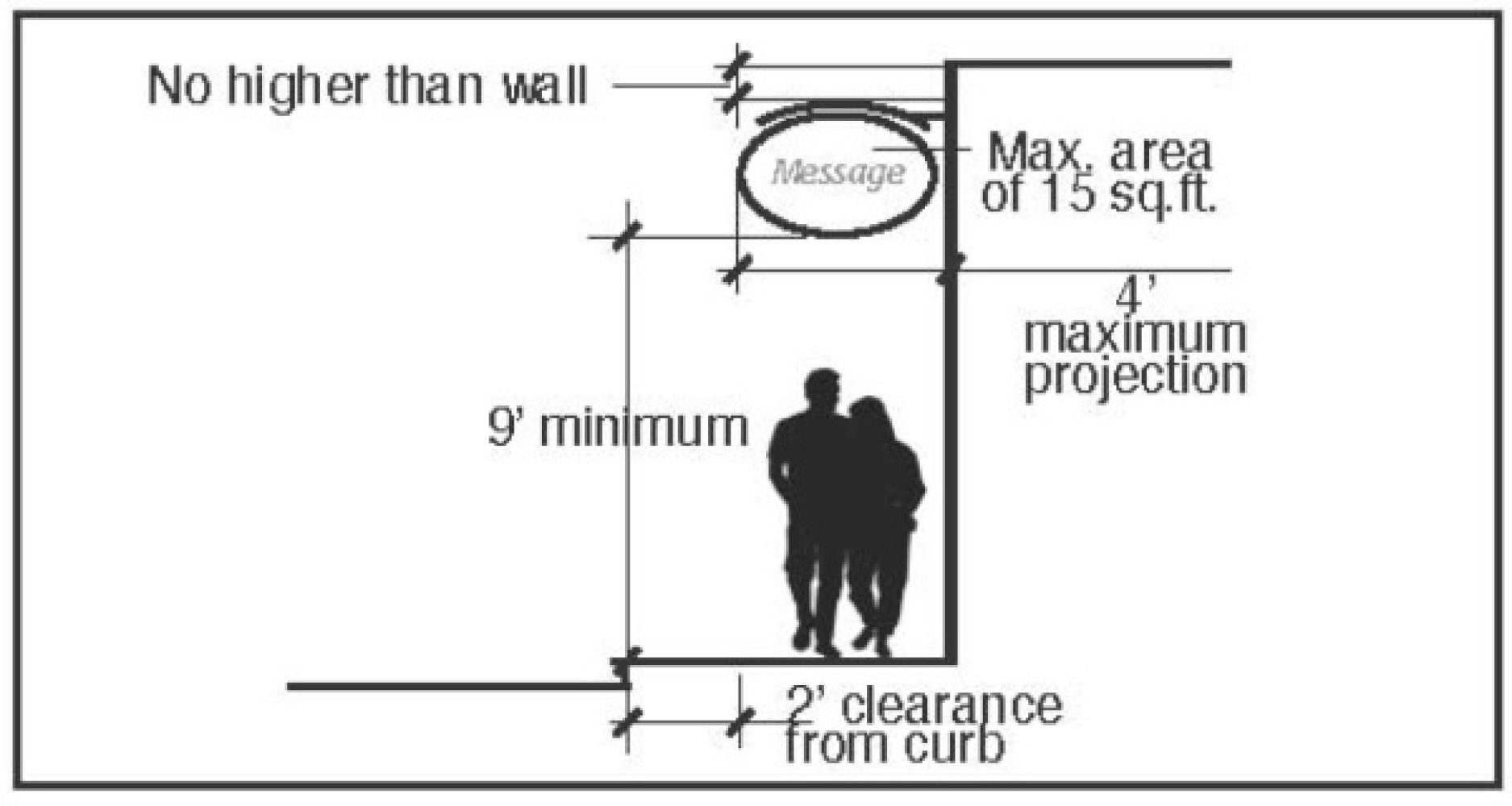 Projecting signs shall not be higher than the wall from which the sign projects if attached to a single story building, or the height of the bottom of any second story window if attached to a multi-story building. Projecting signs shall not extend more than four (4) feet from the face of a supporting building, and be no closer than two (2) feet to a curb line.