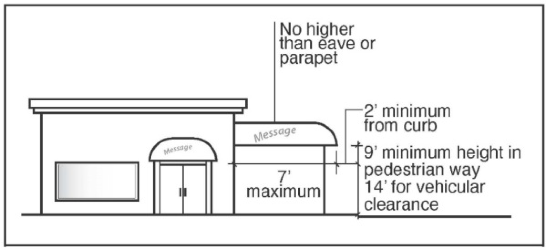 Canopy signs shall not extend over a public right-of-way more than seven (7) feet from the face of a supporting building,