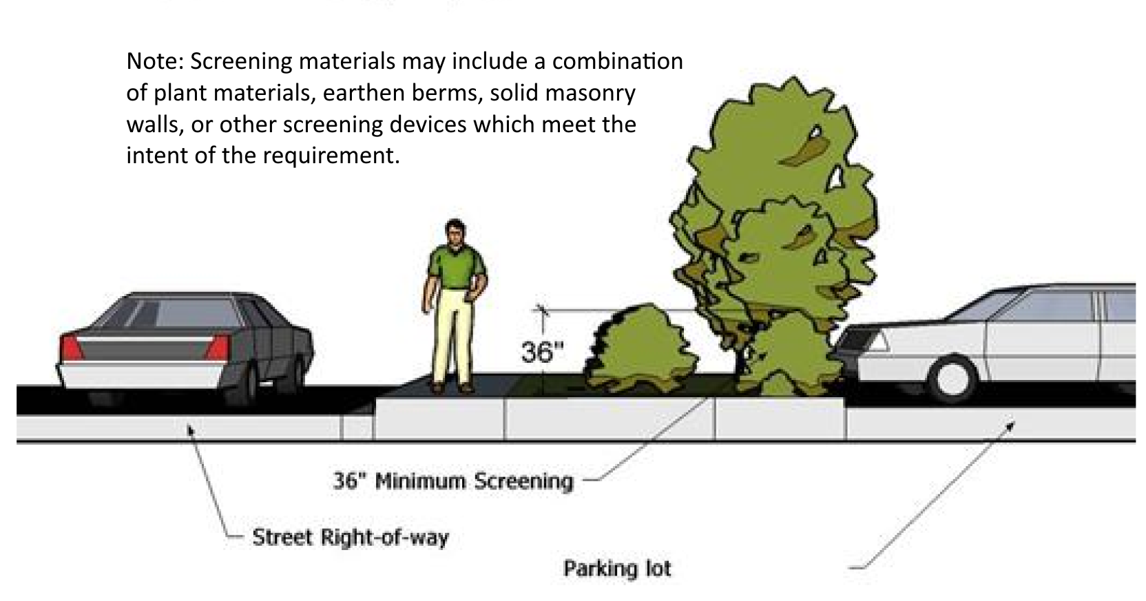 A berm that is at least four (4) feet higher than the finished elevation of the loading dock (at the nearest point) and a minimum of one (1) tree and ten (10) shrubs for every thirty (30) feet of frontage shall be provided. Shrubs shall be placed on the property such that vehicular uses are screened from view as seen from the street or neighboring properties. Perennials and groundcovers are encouraged to compliment the site design.
