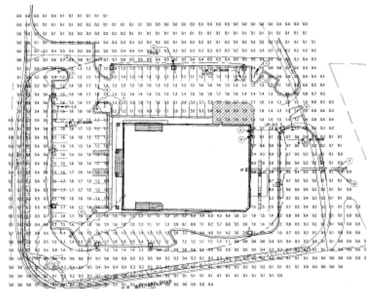 A photometric plan will be required as a supporting document for parking lots with equal to or greater than thirty (30) parking spaces. Said photometric plan must show the locations, size, height, orientation, design, construction details, catalog cuts and plans for all of the outdoor lighting and signs, including wall-mounted lighting. The plan must show the levels of illumination measured in horizontal footcandles at ground level in a regularly spaced grid pattern extending sufficiently past the project property lines. A catalog sheet showing the proposed lighting fixtures must be included. Example: