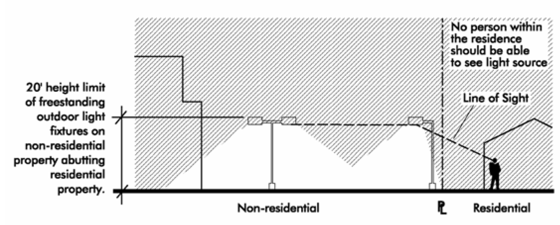 Where nonresidential sites are adjacent to residential sites (existing or future residential areas as shown on the officially adopted version of the Land Resource Management Plan), the light level at the property line produced by the nonresidential lighting shall not exceed two-tenths (0.2) footcandles. The lighting shall be designed to avoid casting direct light or glare onto the adjacent residential property. Acceptable means to prevent glare or direct light onto the residential property include pole/luminary-mounted shields and dense vegetation. On abutting nonresidential properties (existing or future nonresidential as shown on the officially adopted version of the Land Resource Management Plan), or public streets the maximum illumination at the property line shall be five (5.0) footcandles. Where residential is across a street, the maximum illumination at the use's boundary shall be two (2.0) footcandles.