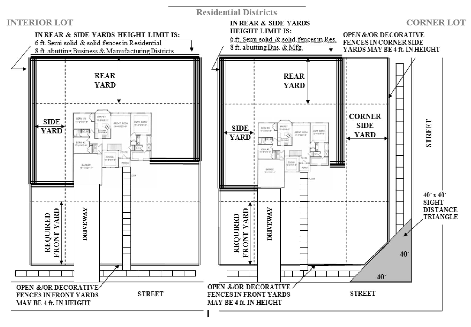 Only decorative or open fences, which do not exceed four (4) feet in height, are allowed in a front yard. (The front yard is a yard lying between the roadway right-of-way line and the nearest line of the building.)