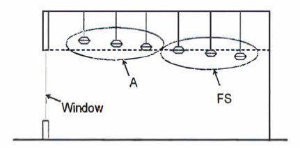 Figure A: Elevation view showing an application of indoor lighting, labeled 'FS,' which is subject to these requirements and indoor lighting, labeled 'A,' which is installed so that it is typically not subject to these requirements.