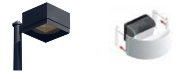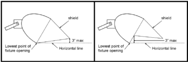 Figure D: The lights on the left are nonconforming due to inadequate shielding. Those on the right can be used in most cases. However, the mounting height and proximity to the property line may require additional shielding to prevent the lamp from being visible from other property.