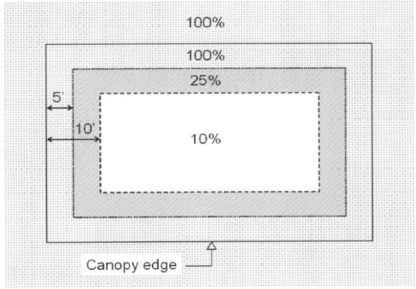 Figure J: Plan view of a canopy, showing fixture location and lumen lamp output percentage counted toward total lumens.