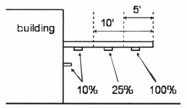Figure K: Elevation view of a canopy or overhang attached to a building, showing location of shielded fixtures and the initial lamp output percentage to be used in calculating total output lumens.