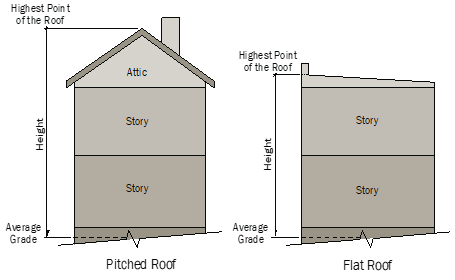 Structure height is measured in both number of stories and feet from the average grade to the top of the highest point of the roof.