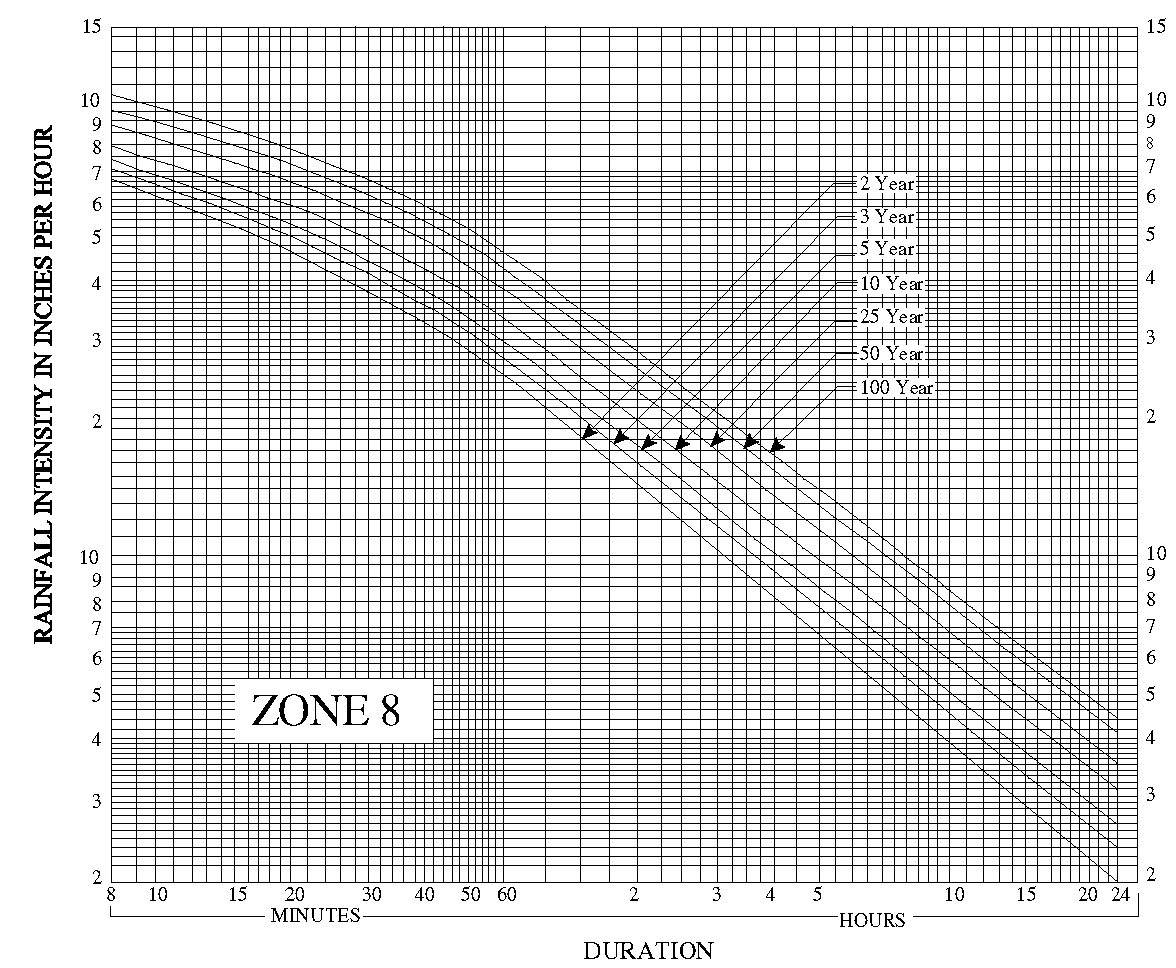 "I" will be determined by using the intensity-duration-frequency zones and curves shown in Figure A1 and Figure A2.