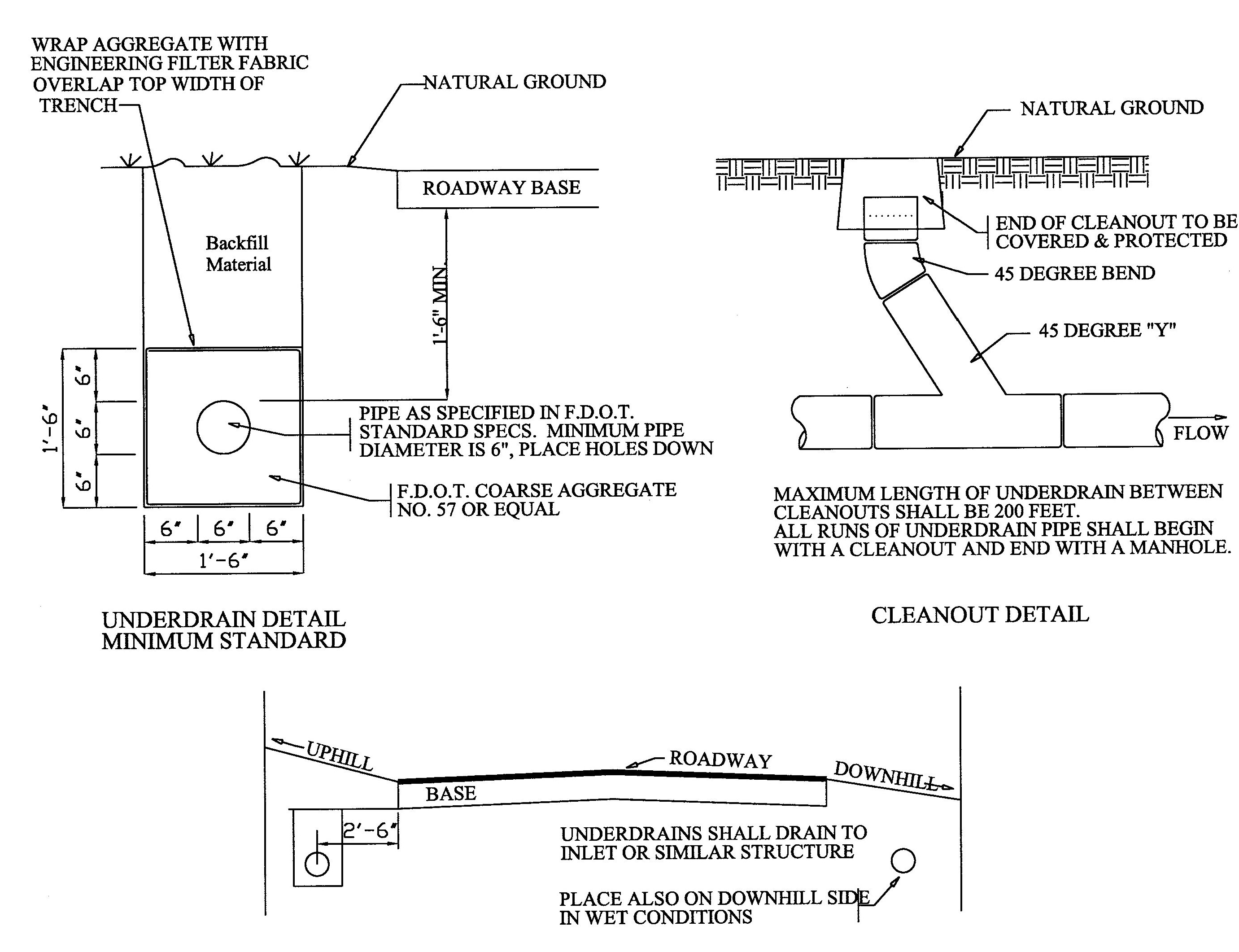 Underdrains will be placed on the uphill side of the road (or on both sides, where needed) with the crown of the underdrain pipe four feet below natural ground or one-half feet below the base, whichever is the lower. The underdrain systems shall be designed by the engineer using the guideline specified below. Cleanouts, where required, shall be designed in accordance with Figure A5. Alternate underdrain designs shall be reviewed by the County Engineer.