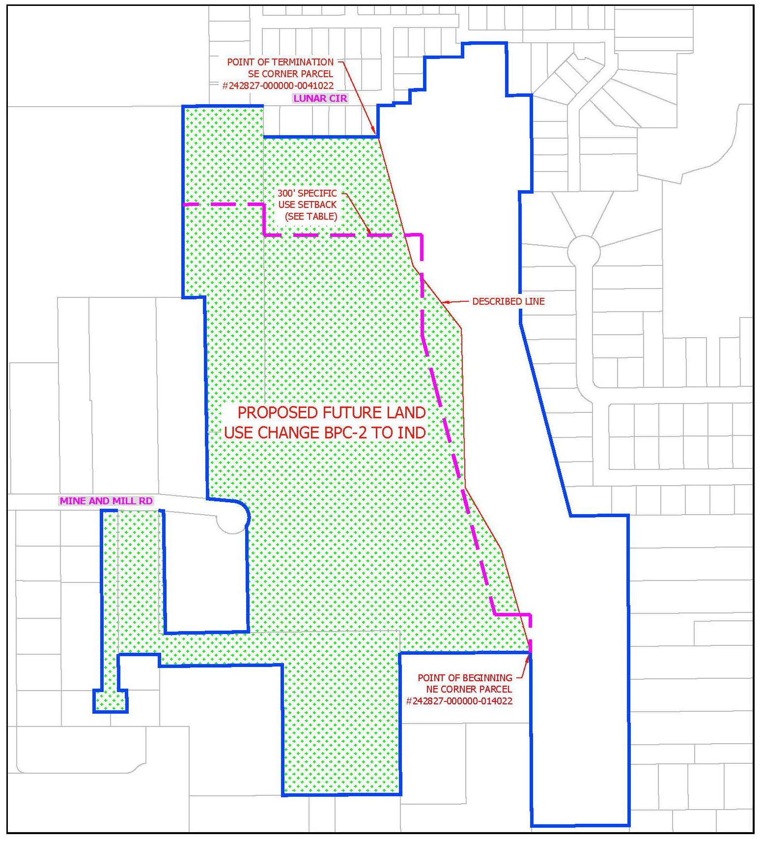 Within 100 to 200 feet, industrial activities including, but not limited to such as Non-Phosphate Mining, Off-site Agricultural support, General Farming, Solar Electric - Power Generation Facilities, Commercial Vehicle Parking, Light Assembly, Light Manufacturing, Light Repair, and other uses similar in intensity and activity, but do not have any outdoor storage or operations, shall be allowed in this area. Additionally, the uses allowed by LDCU 2024-24, as approved by the Planning Commission on October 2, 2024, shall be allowed in this area. Light and General Manufacturing and all other uses permitted in Industrial listed in the Land Development Code Section 205 Table 2.1.