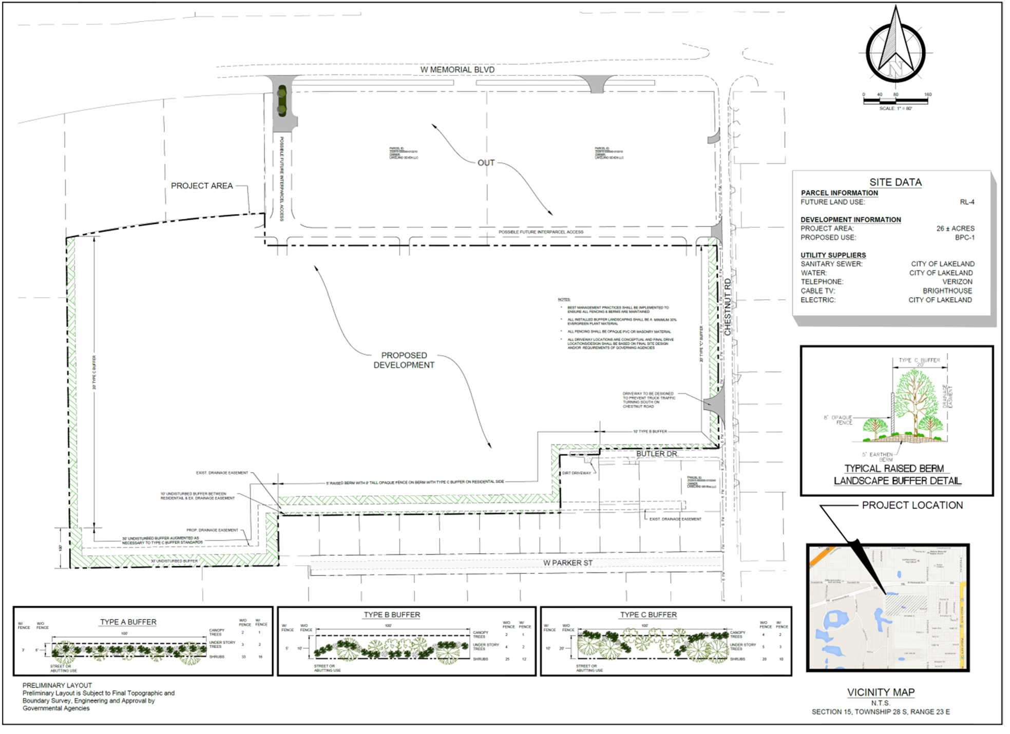 The landscaping on the eastern boundary, except for driveway cuts, shall be consistent with a Type "C" Buffer as indicated in Section 720 of the LDC; and