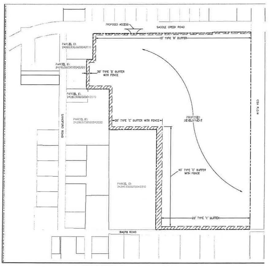The required 25-foot-wide landscaped buffer to be located next to the CSX railroad, on the eastern side of the subject property, shall be planted when site development activity occurs within 200 feet.