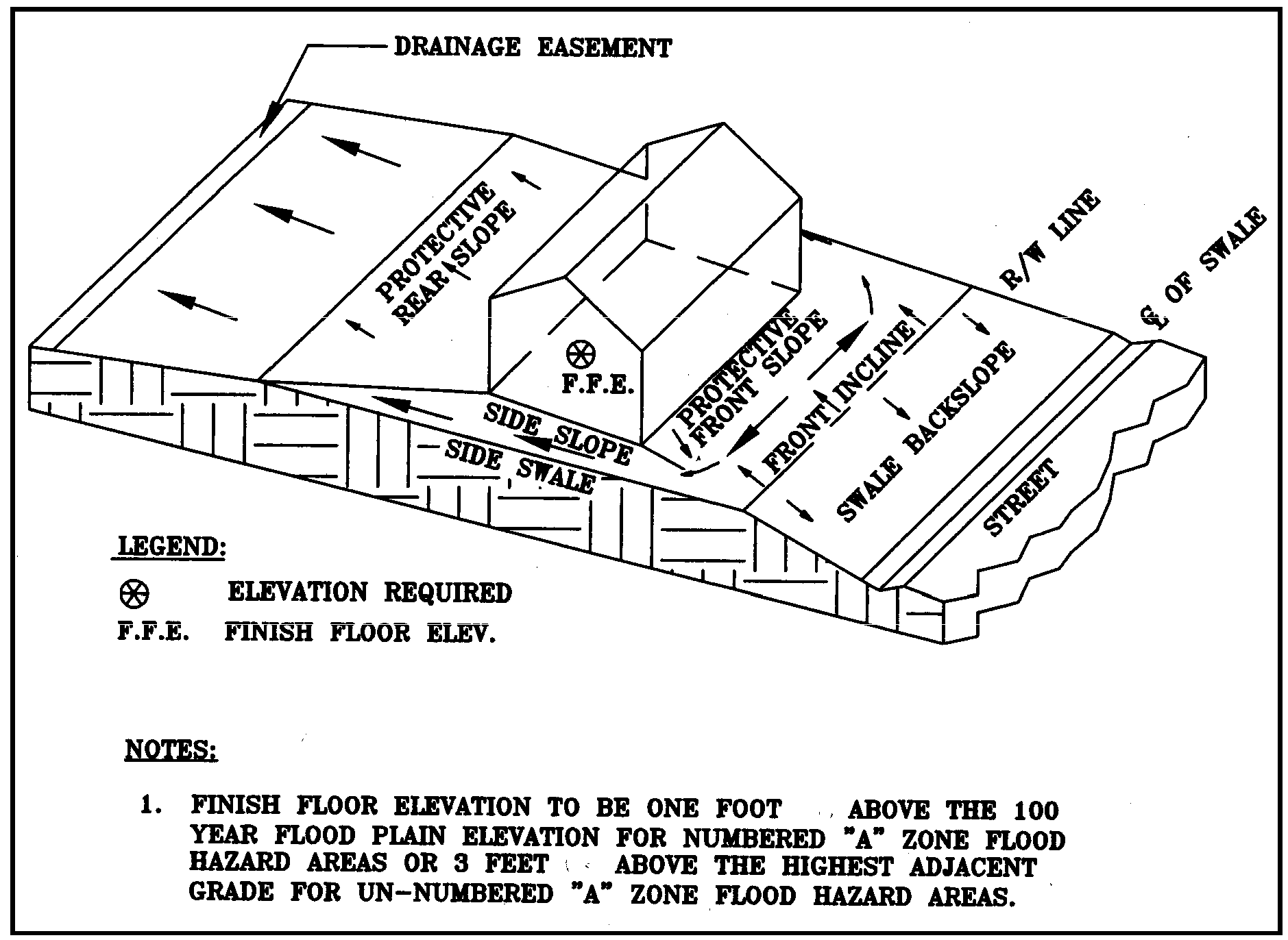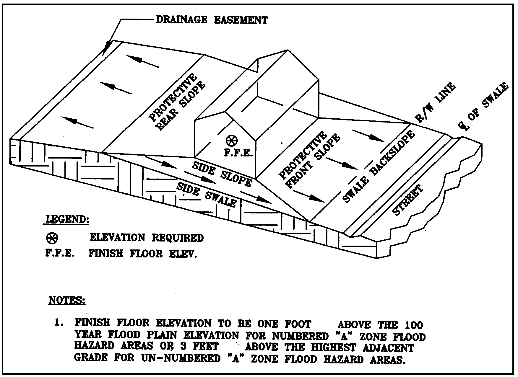 The permit applicant shall provide an adequate drainage system whereby either surface water runoff from normal rainfall events is retained on-site and does not drain onto adjacent properties, or is directed into a legal, positive outfall following BMP implementation. Choosing from the four lot grading plans provided, Types A, B, C, or D (figures 2.1 through 2.4), will expedite the review and inspection.