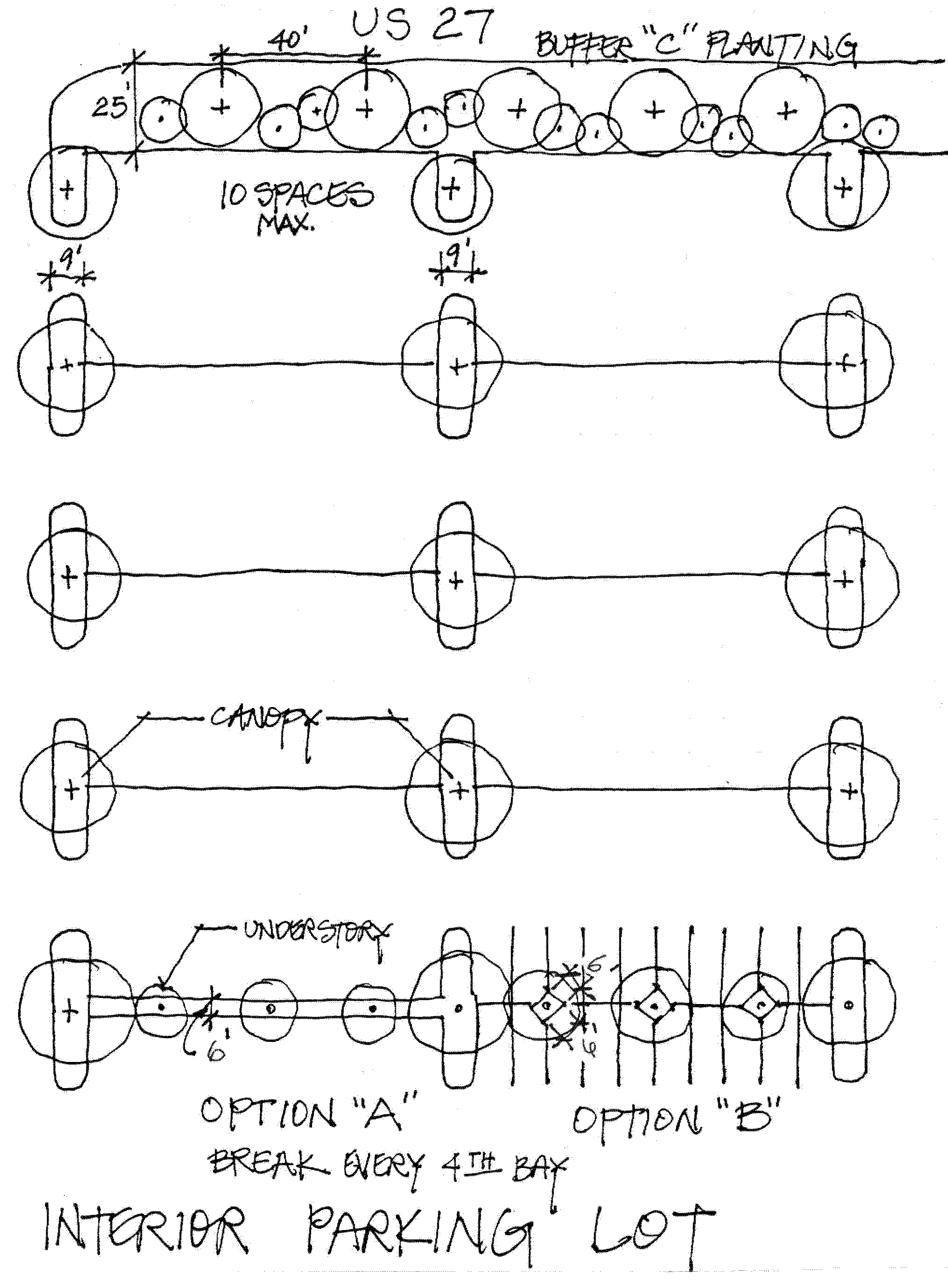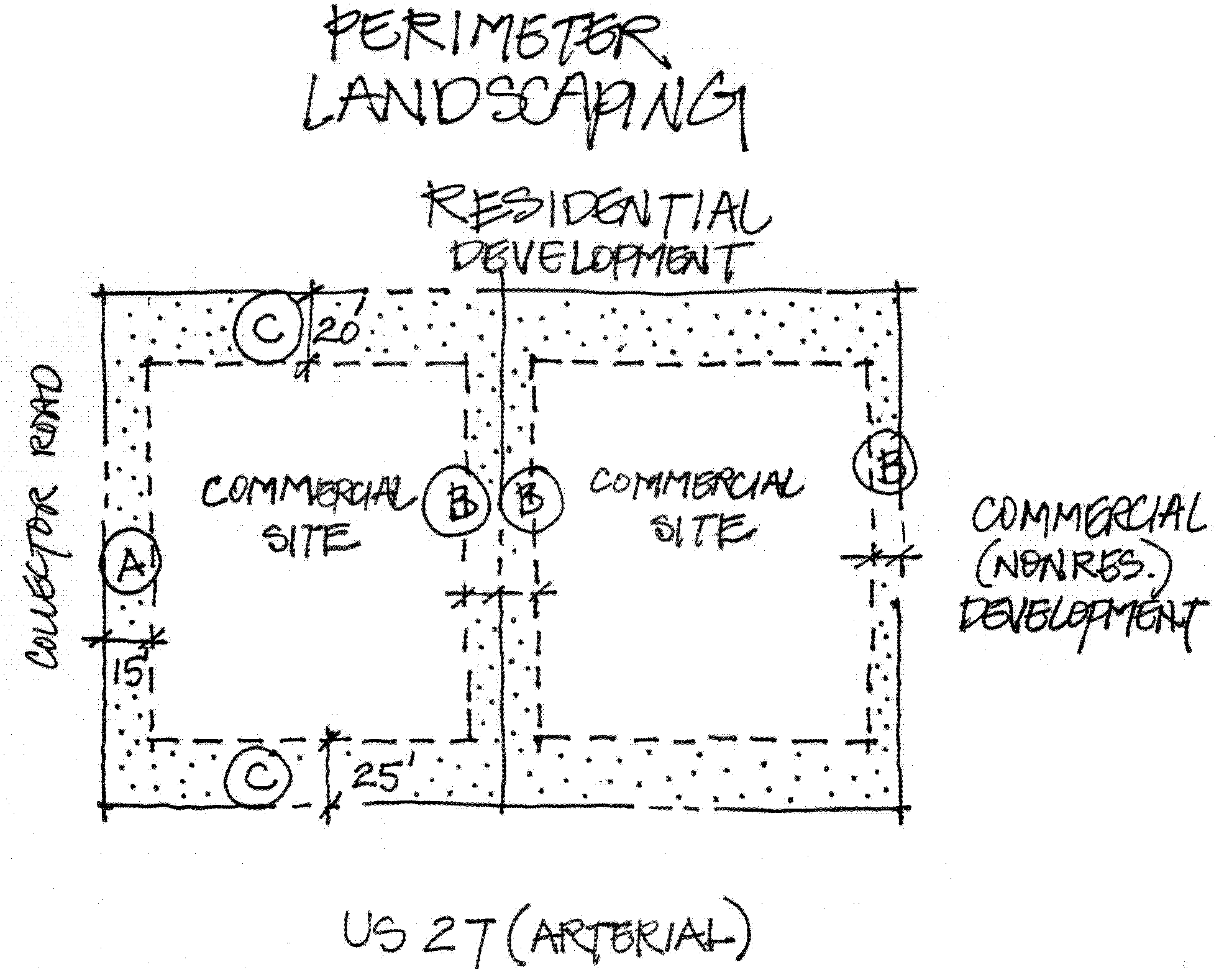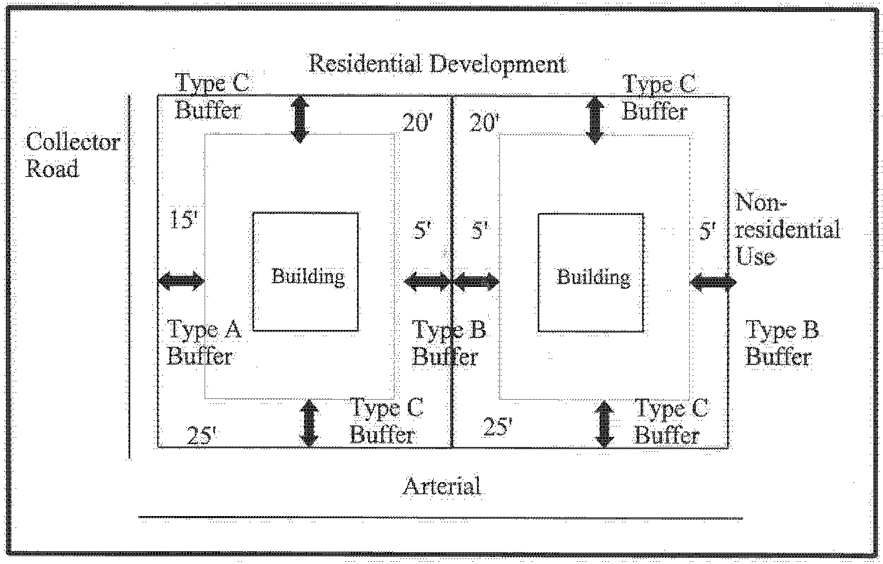 Landscaped in accordance with the planting requirements of a Type "C" Buffer. These landscape requirements may include plant clustering or alternative planting schemes approved by the Development Review Committee; and,