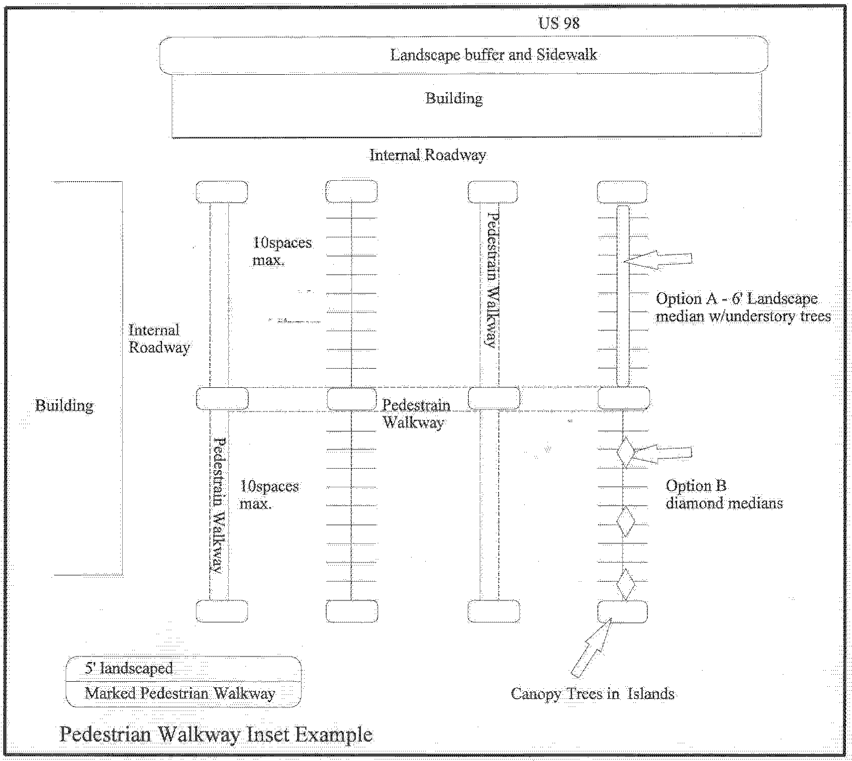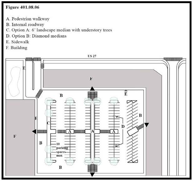 Parking space requirements for non-residential and commercial development may be reduced by up to 60% of the required parking spaces in Section 708, of the Land Development Code; however, the applicant shall provide a parking space reduction plan to demonstrate how the proposed development and site plan will promote a pedestrian-oriented community based on the following criteria: